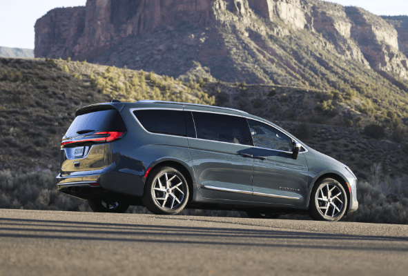 除了前脸,Pacifica的侧面轮廓和车尾灯条变化不大,内饰也基本保持原样。克莱斯勒强调了新的方向盘徽标、装饰和Pinnacle版的Blue Agave内饰,但仪表盘、中控台等布局仍延续2021年版本,整体感觉与2017年车型相似。