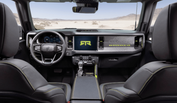 内饰亮点包括定制的等高线图案横跨副驾驶侧仪表板,配有超亮柠檬绿Bronco徽章,视觉主题延续到中控台的专用Bronco RTR标志。前排座椅压印RTR标志,信息娱乐系统配备定制启动动画。作为顶级风格车型,Bronco RTR标准配置包括加热座椅、双区气候控制和福特的Co-Pilot 360套件,覆盖舒适性和驾驶辅助功能。