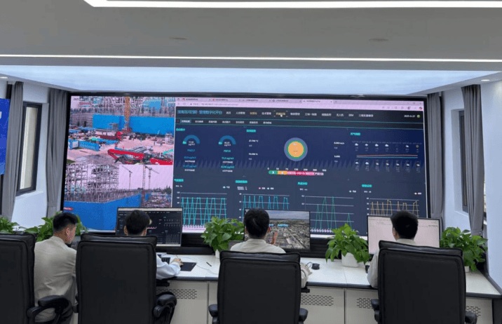 走进项目智慧管控中心,一块巨大的可视化大屏映入眼帘。屏幕上,人员分布、施工进度、环境监测、安全预警等数据实时跳动,仿佛一座“数字孪生工地”正在同步运行