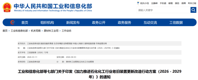 工业和信息化部等七部门关于印发《加力推进石化化工行业老旧装置更新改造行动方案(2026-2029年)》的通知