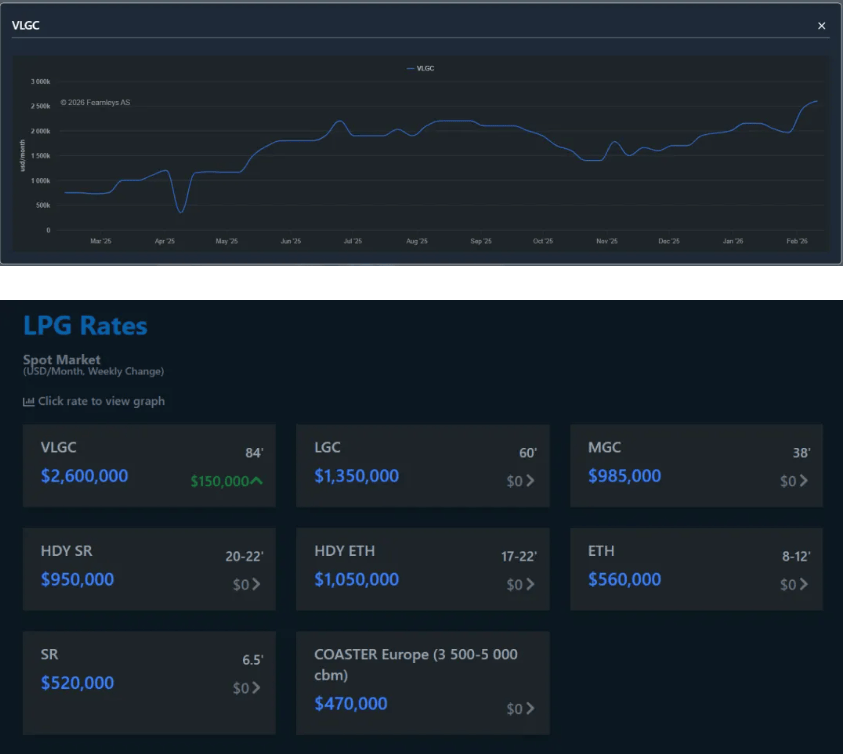 据另一家经纪公司Fearnleys数据显示,目前VLGC运价处于260万美元/月的水平,较上周上涨15万美元,上涨6%。