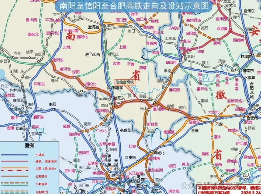 南信合铁路是纳入《“十四五”铁路发展规划》的重点项目,线路自郑渝高铁南阳东站引出,沿既有宁西铁路通道向东延伸,途经河南南阳、驻马店、信阳及安徽六安,终至沪渝蓉沿江高铁金寨东站,并通过衔接合肥枢纽实现与长三角地区的高效连通。