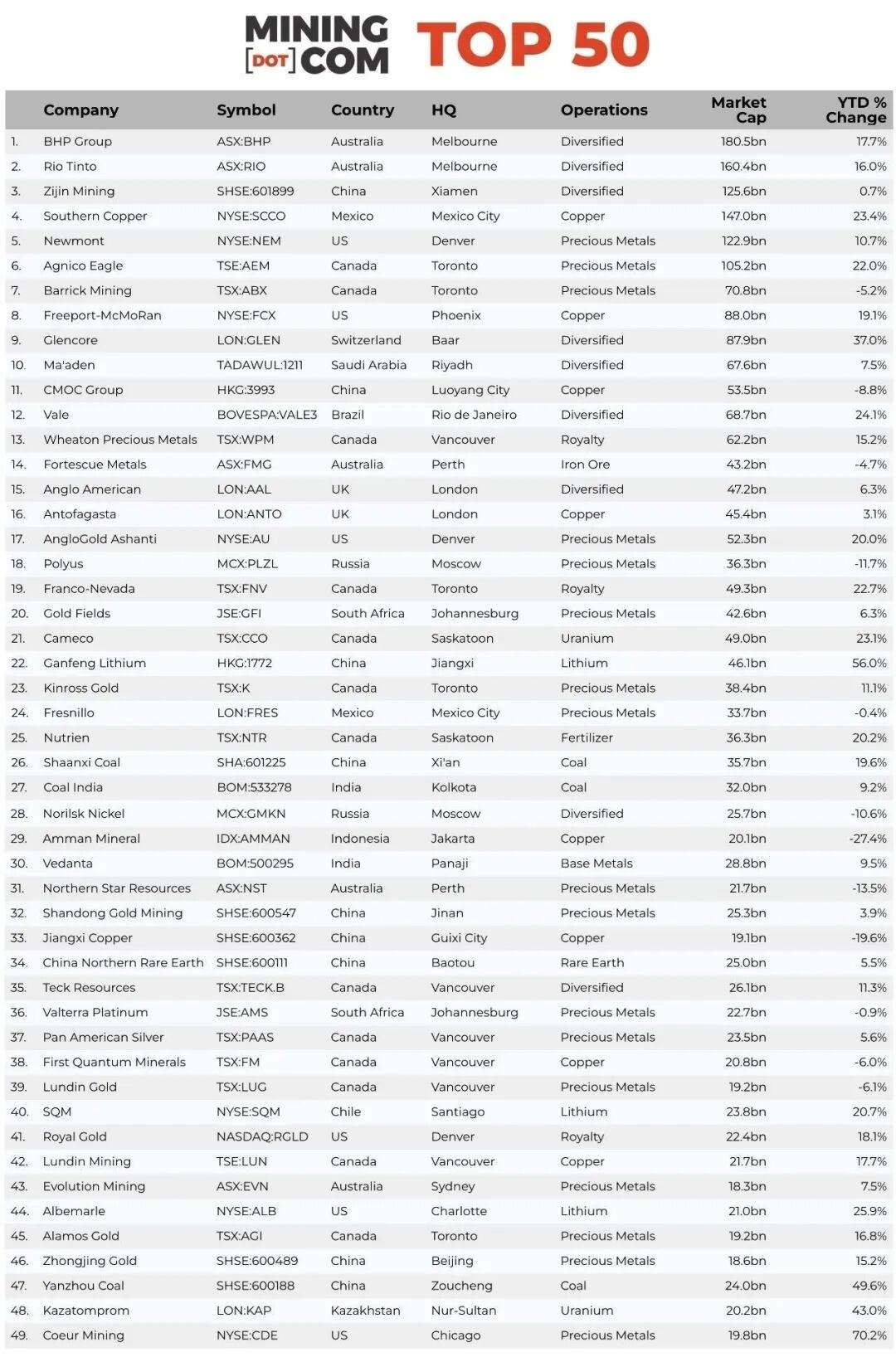 维度网讯,截至2026年第一季度末,全球市值最高的50家矿业公司总市值达2.41万亿美元,2025年至今已增长2500亿美元。其中,紫金矿业以1256亿美元市值稳居全球矿业第三,仅次于必和必拓与力拓,成为全球前十中唯一的中国企业,彰显国际矿业第一梯队地位。这一成绩不仅体现了紫金矿业自身强大的资源储备、开采能力以及高效的管理运营水平,更反映出其在全球矿业市场中的重要影响力与竞争力。