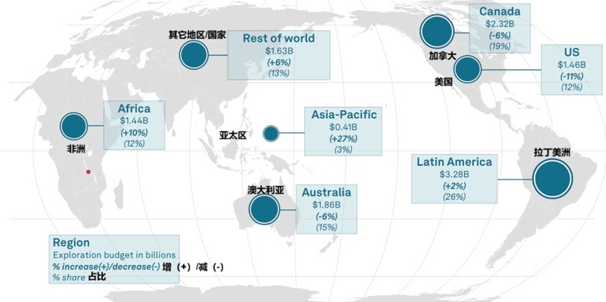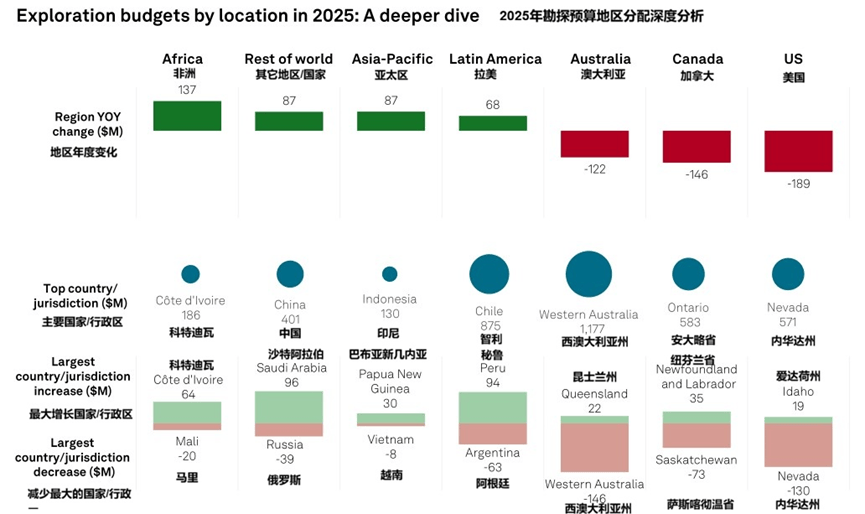 区域表现分化显著,加拿大、美国、澳大利亚等传统矿业大国受初级勘查公司融资限制,支出有所减少;拉丁美洲和非洲国家因黄金、铜价走高及大型矿业公司资金支持,支出表现强劲;沙特阿拉伯勘探预算大幅增长。
