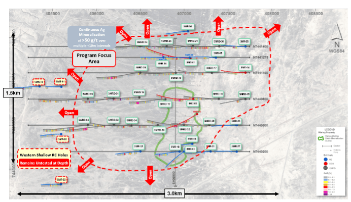 进一步钻探结果显示,从开始深度起,242米范围内铜品位0.65%、银品位6.8克/吨,包括从298米开始、20米范围内铜品位2.25%、银品位25.9克/吨,以及从332米开始、32米范围内铜品位1.03%、银品位12.0克/吨。从604米开始、22米范围内铜品位1.70%、银品位15.1克/吨的区间也被记录。额外钻探结果返回了广泛的矿化区间,具有一致的银信用,进一步强化了系统的连续性。选定的亮点包括从438米开始、10米范围内铜品位4.24%、银品位37.8克/吨,从162米开始、74米范围内铜品位1.62%、银品位11.9克/吨,以及从374米开始、6米范围内铜品位2.09%、银品位46.0克/吨。