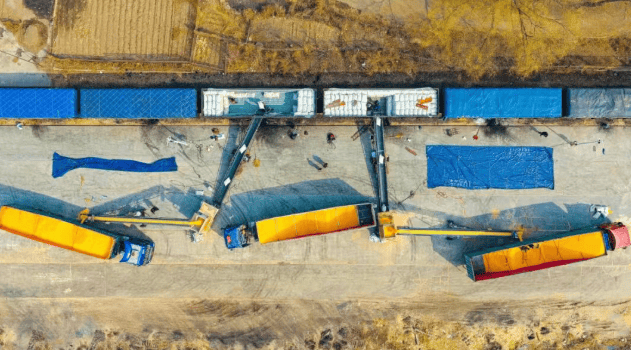 两家物流中心还使用专为小麦、玉米、大豆等散粮散货运输设计的顶开门集装箱,在粮食装运时,通过传送带将地面的粮食运送至箱体顶部,再通过可开关的“天窗”,实现快速装粮。