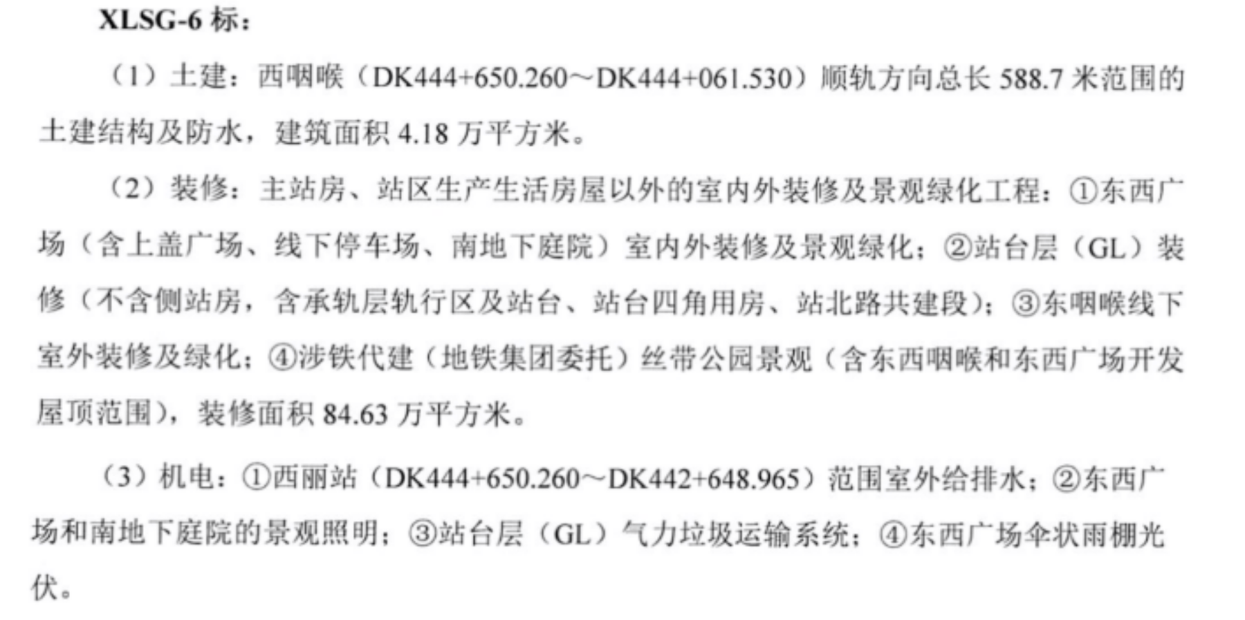 (1)新建深圳西丽站站房及相关工程(DK444+650.260~DK442+648.965)。其中站房面积11.99万平方米,铁路配套设施24.43万平方米(旅服、线下预留候车厅、铁路自营停车场、垃圾转运站及真空卸污泵房、物流作业区、旅客活动平台等);东西咽喉区结构工程。