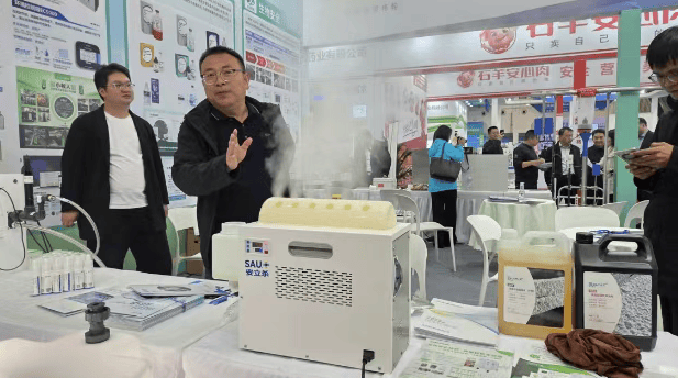 北京中农优嘉生物安全事业部产品经理平敬涛介绍,超微冷雾气溶胶发生器可生成1~10μm气溶胶,悬浮时间长、覆盖空间大,能深入角落和缝隙实现立体消毒,适配规模化养殖场需求。陕西鑫诚大唐生物制药展出的纯中药产品“大唐奶宝”,应用蒲公英、鱼腥草提取物解决奶山羊乳房炎问题,用药后当天可交奶,无残留。