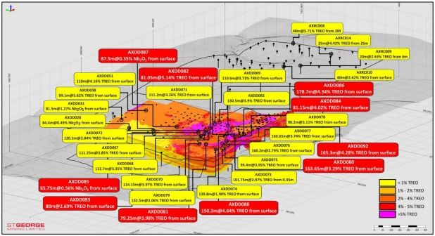此次钻探成果源于15个金刚石钻孔的广泛化验,其中多个矿段呈现显著厚度与高品位特征:地表起165.3米处TREO品位4.28%、Nb₂O₅品位0.61%;81.05米处TREO品位更达5.14%。斜截面图显示,最新钻孔(红色标注)与既有勘探数据形成高品位矿化网络,A-A'与B-B'截面图进一步证实矿段边界品位(TREO≥1%、Nb₂O₅≥0.2%)与现有矿产资源估算(MRE)轮廓的扩展潜力。