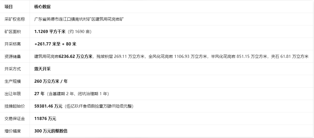 维度网讯,近日,中国广东省清远市自然资源局发布公告,通过清远市公共资源交易平台挂牌出让英德市连江口镇南坑村建筑用花岗岩矿采矿权(编号:清政务矿挂出〔2026〕003号)。该采矿权采用露天开采,矿区面积1.1269平方千米,资源储量6236.62万立方米,生产规模260万立方米/年,出让年限27年(含基建期2年、闭坑治理期1年)。起始价59381.46万元,交易保证金1.19亿元。本次出让经清远市人民政府批准,由清远市政务服务中心组织实施网上挂牌。