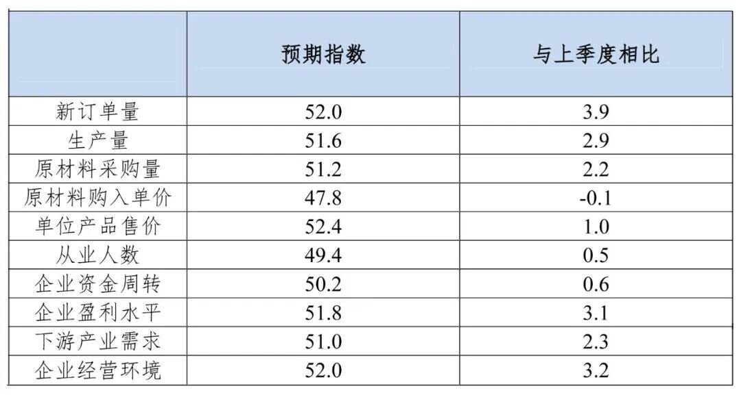 一季度,生产量预期指数为51.6,较上季度上升2.9个点。其中,21.0%的企业认为未来企业的生产量比上季度“增加”,71.0%的企业认为未来企业的生产量与上季度“基本持平”,8.1%的企业认为未来企业的生产量比上季度“减少”。