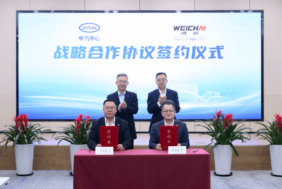 山东重工党委委员、副总经理,潍柴集团党委书记、董事长马常海,中国重汽党委书记、董事长刘正涛与中汽中心党委委员、副总经理周华分别签约。