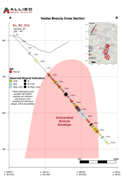 维度网讯,4月7日,Allied Critical Metals宣布,其葡萄牙北部Borralha钨矿项目钻探取得重要进展,新确认的Venise角砾岩目标区域发现超过200米的角砾岩型钨矿化带,伴生热液蚀变带、石英-硫化物脉及可见黑钨矿、辉钼矿和黄铜矿。该区域位于公司初步经济评估(PEA)核心的Santa Helena角砾岩矿床约400米处,证实了历史上已知但未系统勘探的角砾岩系统的连续性。