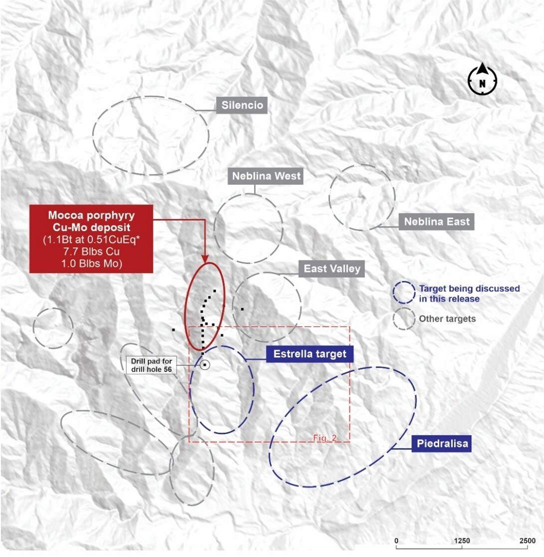La Estrella和Piedralisa位于约一千万年岩浆活动区域内,是九个优先目标中的两个。地表工作显示,La Estrella存在Cu-Mo地球化学异常,土壤值最高达558 ppm铜和264 ppm钼,岩石样品最高达1,105 ppm铜和98.4 ppm钼,与斑岩系统蚀变和矿化细脉相关。Piedralisa位于Mocoa矿床东南约3公里,岩石样品最高含1,280 ppm铜和89.8 ppm钼,矿化赋存于蚀变火山岩和侵入岩中。
