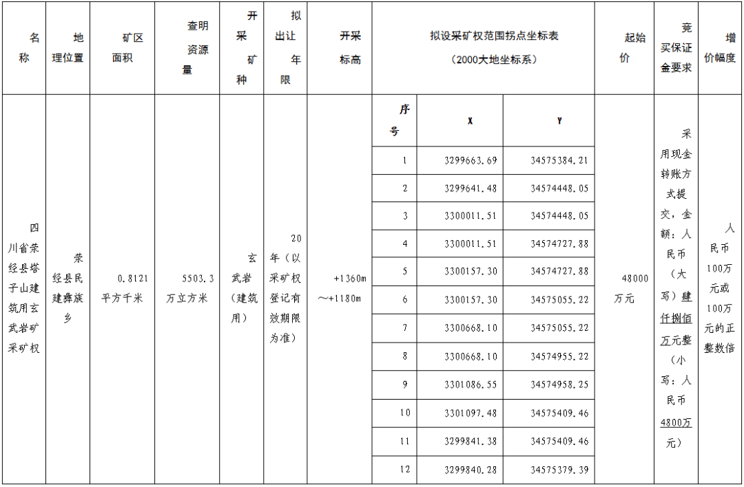 维度网讯,近日,中国四川雅安市政务服务和公共资源交易服务中心受四川雅安市自然资源和规划局委托,发布四川省荥经县塔子山建筑用玄武岩矿采矿权挂牌出让公告,起始价4.8亿元人民币,挂牌时间为2026年5月8日至5月21日。