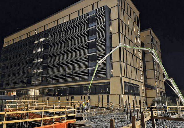 该学校建设新建设施与加里·托马斯能源工程大楼以人行桥连接。桥梁通过弯曲工字梁承载,设特氟龙板滑动支座应对建筑差异沉降。楼内实验室按主题邻里布局,暖通空调主管道保留20%备用容量。该学校建设项目目前完成约92%,围护结构测试与陶土雨幕覆层安装同步推进。室外剩余景观、灌溉及硬景观工程待施工。
