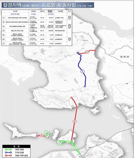 在江华、瓮津郡,项目包括西海南北和平道路、国道支线84号线(吉祥∼仙源)等共7条道路,全长31.93公里。江华地区方面,随着近日开工的桂阳∼江华高速公路相衔接,广域市道60号线(新井∼冷井)项目已启动可行性调查。