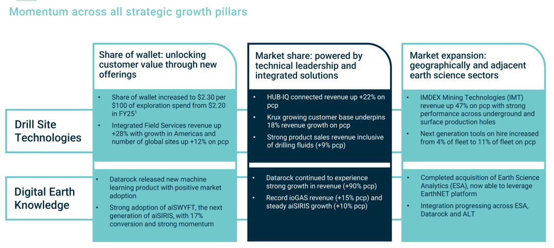 通过上述收购,IMDEX构建了从数据采集、AI分析到可视化的完整“岩石数据”工作流:传感器端采用ALT和Mount Sopris的高精度探头采集钻孔图像,分析端利用Datarock和Earth Science Analytics的人工智能算法自动识别矿物和结构特征,展示端通过WellCAD软件进行数据可视化,并通过IMDEXHUB-IQ云平台实现全球数据的实时互通。IMDEX专注两大核心业务领域:钻场技术由首席运营官Shaun Southwell负责,涵盖钻井液、井下传感器和定向钻探技术;数字地球知识由首席战略官Michelle Carey负责,集成传感器、云平台和AI分析能力,提供地下岩层实时数据分析服务。该整合旨在帮助矿业客户从资源勘探到生产的全周期中以更高精度和更快速度界定并开采矿体。