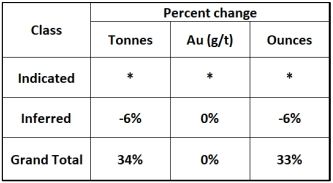 更新的Napié黄金项目矿产资源与之前矿产资源的对比(之前的模型中没有指示资源)。