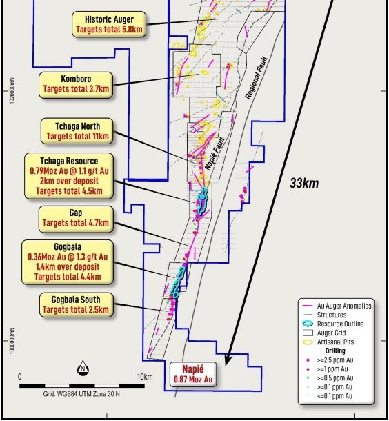 尽管资源增长,Napié勘探仍处早期阶段,30公里长的Napié剪切带仅约13%进行系统性钻探。项目位于西非Birimian绿岩带,该区域以大规模造山型黄金系统著称。目前,一项30,000米金刚石钻探计划正进行,旨在扩大资源基础和改善分类。