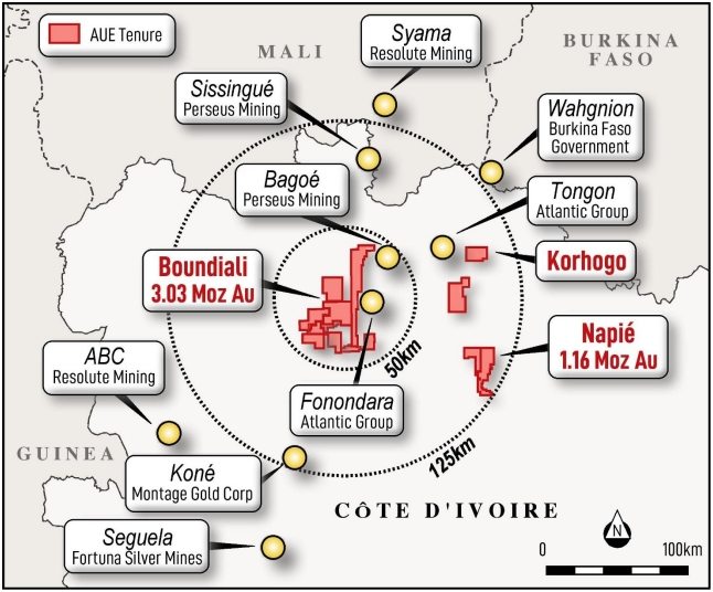 Aurum董事总经理Caigen Wang博士表示:“这次MRE更新(在完成Mako Gold收购后的12个月内交付)对Napié黄金项目和Aurum整体而言都是一个重要里程碑。最让我们兴奋的是这次更新所揭示的关于更广泛Napié机会的信息。”两个矿床的矿化在走向和深度上保持开放,Tchaga深部钻探已证实延伸至地表300米以下。