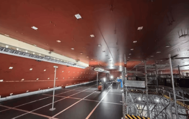LNG运输船H5186实现平行体下水节点后,大连造船在仅3个月的系泊期内高效完成强度试验,货物围护系统建造取得新进展。其中,1货舱、4货舱整舱螺柱楔块全部完工并实现绝缘板开工,2货舱、3货舱绝缘板实现全流程完工,回坞后可立即开展粘连作业。