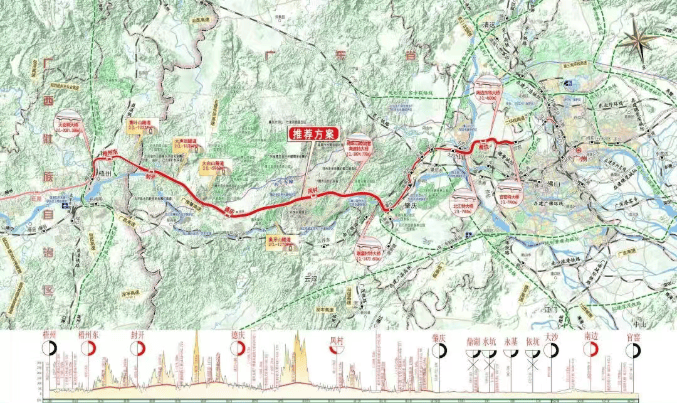 根据预可研方案:柳广铁路梧州至广州段为双线国铁I级客货共线铁路,新建线路全长约258公里,设计速度目标值160km/h,具备开行动力集中型动车组和双层集装箱列车运输条件。