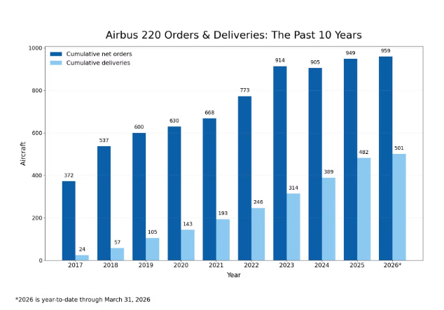 维度网讯,4月10日,空客公司(Airbus)宣布其A220飞机项目累计交付量正式跨越500架里程碑。根据2026年3月的最新订单与交付报告,当月空客共计交付8架A220,使该系列机型自投产以来的总交付量累计达到501架。第500架飞机已于近期交付予波罗的海航空。