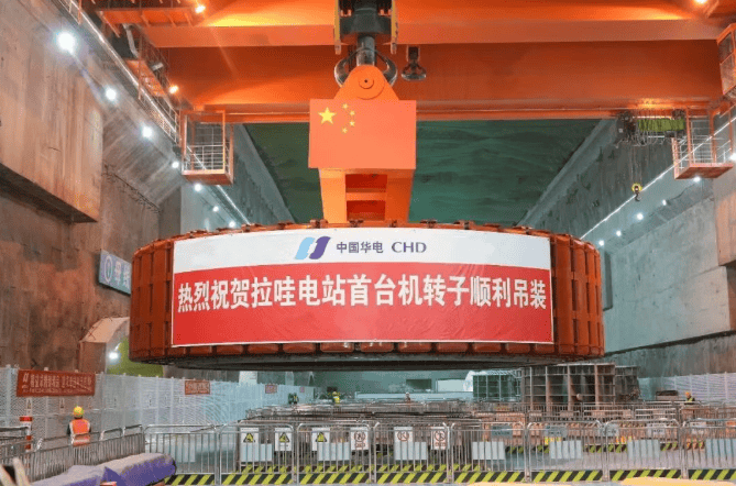 拉哇水电站位于四川省巴塘县与西藏自治区芒康县交界的金沙江干流,是国家“十五五”规划重点建设的金沙江上游水风光一体化基地重要组成部分,总装机容量200万千瓦。本次吊装的转子直径13.43米,高3.10米,总重量约1007吨,是拉哇水电站机组重量最大的部件。