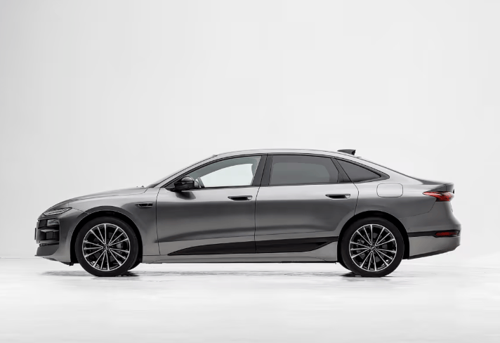 车身侧面保留了三厢结构,这是专为中国市场设计的造型。侧裙嵌入黑色高光饰条,搭配电控门把手,增强了运动感。车辆长宽高分别为5073毫米、1942毫米和1522毫米,轴距达到3076毫米。尾部配备贯穿式第二代OLED尾灯,同样支持8种数字签名,并具备车联网交互能力,可向其他车辆发出安全预警。