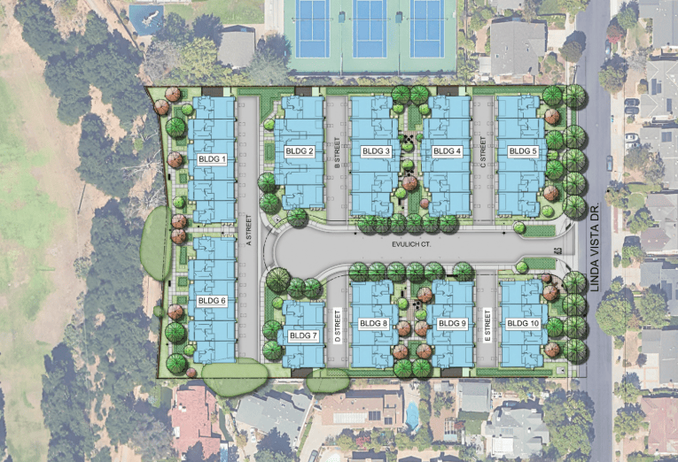 维度网讯,美国加州圣克拉拉县库比蒂诺市10857 Linda Vista Drive联排别墅开发计划近日获批,开发商为Summerhill Homes。该联排别墅项目占地2.53英亩,拟建十栋建筑共51套四居室单元,总建筑面积约145500平方英尺,每套联排别墅配私人两车位车库,含11套经济适用房。