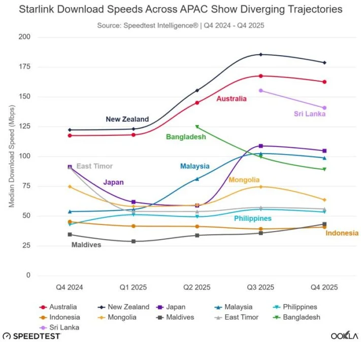 在亚太地区,星链的服务性能因市场成熟度和网络设施布局而存在差异。澳大利亚和新西兰等较早开通服务的市场表现突出,2025年第四季度澳大利亚的中位下载速度为162.47 Mbps,新西兰则录得35毫秒的低延迟,这得益于密集的地面站建设。Ookla报告指出,低地球轨道卫星宽带的核心优势在于接近网关设施,能有效提升速度并降低延迟,使其性能接近地面网络。