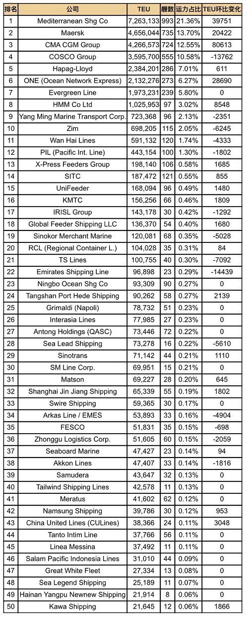 全球班轮公司运力排名前三是地中海航运(726.3万TEU,占比21.36%)、马士基航运(465.6万TEU,占比13.70%)以及达飞轮船(426.7万TEU,占比12.55%)。