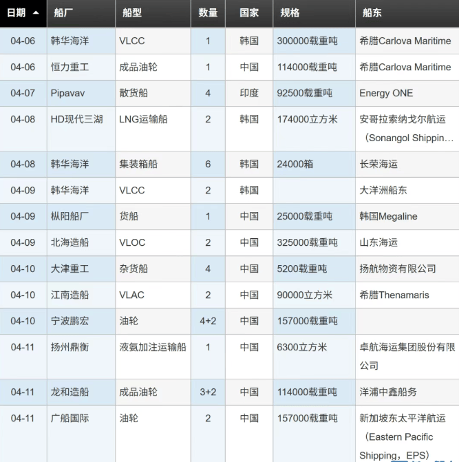 韩国船厂接获11艘,包括韩华海洋3艘VLCC(2艘来自大洋洲船东、1艘来自希腊Carlova Maritime)、6艘集装箱船(长荣海运);HD现代三湖2艘LNG运输船(安哥拉Sonangol Shipping)。