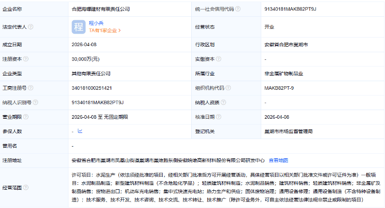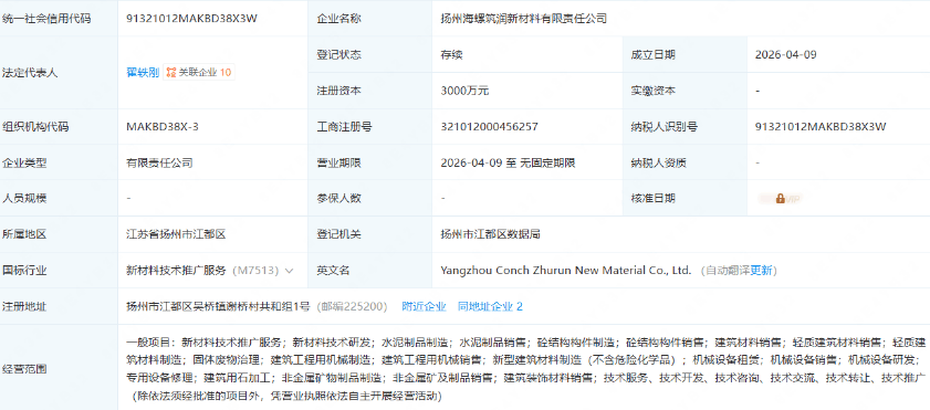 4月9日,扬州海螺筑润新材料有限责任公司成立。法定代表人为翟轶刚,注册资本3000万元。经营范围包含新材料技术推广服务、新材料技术研发、水泥制品制造、水泥制品销售、建筑材料销售、新型建筑材料制造等。
