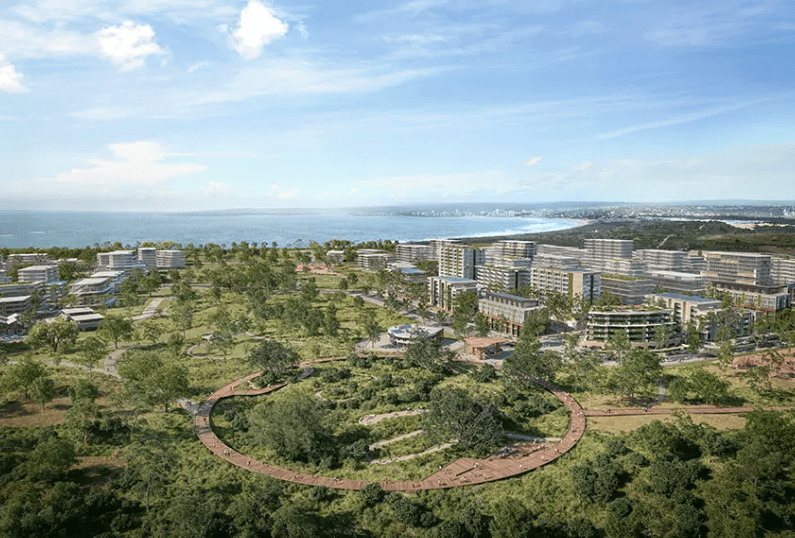该城市建设地块位于Cronulla中央商务区以东6公里,建筑高度3至12层。开发分20年分阶段实施,与沙矿关闭及土地修复同步,西侧已修复部分划为第一阶段城镇中心。提案包含Captain Cook Drive升级以改善交通及紧急通道。