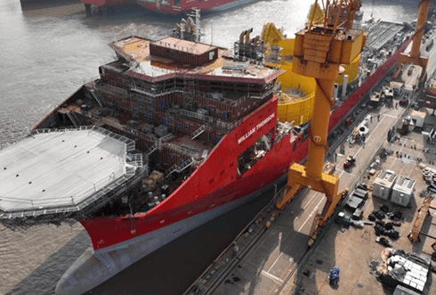 维度网讯,中国招商船舶海门基地为比利时船东Jan De Nul(JDN)建造的第二艘新一代超大型电缆敷设船(CLV)“William Thomson”号举行下水仪式。