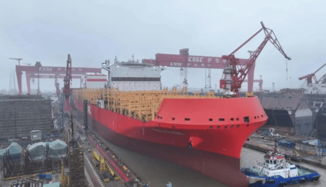维度网讯,4月13日,中国沪东中华造船(集团)有限公司为新加坡太平船务(PIL)建造的13000TEU双燃料集装箱船首制船H1933A船在西部厂区Y1船坞以超高完整性比计划提前5天出坞。