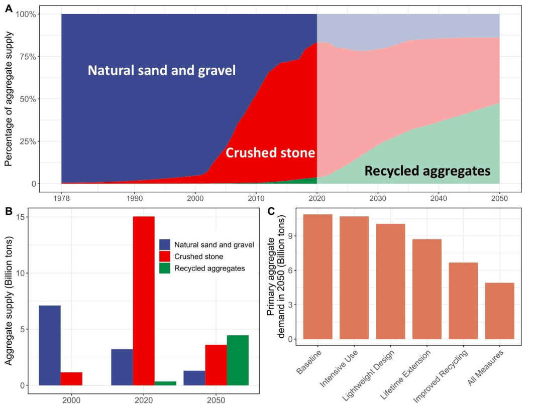 研究显示,中国砂石供给结构已完成第一次历史性转型:2005年前天然砂石占比超80%,2020年机制砂石占比已升至约80%。研究团队设定了强化使用、轻量设计、延长寿命与改善回收等多类循环经济情景进行模型测算。结果显示,通过系统实施循环经济策略,2050年再生骨料有望满足全国砂石总需求的48%,成为与机制砂石并列的主要供给来源,原生骨料开采量较基准情景下降55%,砂石消费总量下降至峰值水平的约50%。该研究还指出,建筑与基础设施寿命延长是削减需求最有效的循环经济措施,较基准情景可降低20%的砂石需求。