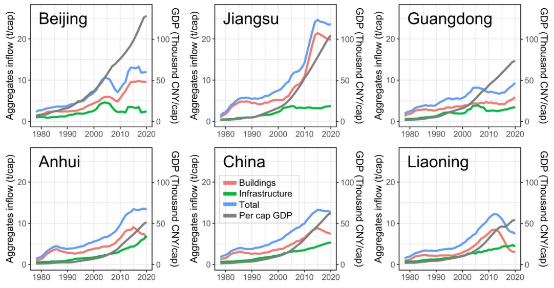 维度网讯,清华大学与牛津大学等机构合作研究团队于10月21日在《自然·通讯》发表论文,首次系统构建覆盖中国31个省份、1978年至2050年砂石资源社会经济代谢模型(CHAMPS)。研究确认中国砂石总需求已于2015年达到约188亿吨峰值,在循环经济情景下2030年后总需求将降至2020年水平的约50%,2040年前后全国人均砂石存量趋于饱和后,再生骨料将成为行业核心供给来源。