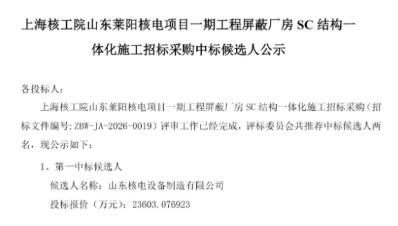 维度网讯,山东莱阳核电项目一期工程屏蔽厂房SC结构一体化施工中标结果公布,山东核电设备制造有限公司以23603.0769万元报价成为第一中标候选人,中国核工业华兴建设有限公司以25981.8199万元报价位列第二。