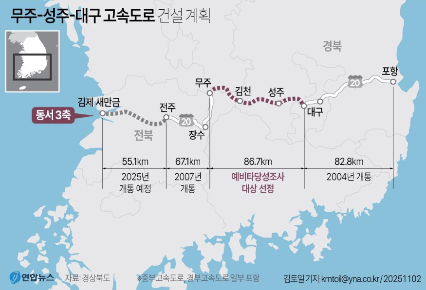 该项目属于东三轴高速公路中尚未开通的路段,连接全罗北道新万金与庆尚北道浦项。东三轴高速公路建设自1992年国家干线公路网建立以来,全线中大邱至浦项段于2004年开通,全州至茂朱段于2007年开通,新万金至全州段于2025年开通。茂朱-星州-大邱段自1999年以来已三次推进,但因经济性不足等原因屡次在预备可行性调查对象中落选。