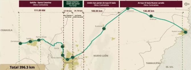 萨尔蒂约至新拉雷多客运铁路全长约396公里,连接蒙特雷都市区与美墨边境。本次招标内容为沿线四座车站(德拉马德罗站、萨尔蒂约站、拉莫斯阿里斯佩站和加西亚站)的设计与建设标段,具体包括:编制并实施相关工程设计及综合施工图;修建四座车站及其站台和站场线路;以及开展线路走向研究、土方工程和其他补充性技术研究。