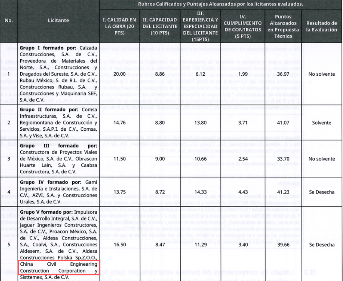 墨西哥Grupo IDINSA牵头联合体(中国土木位列其中)同样技术分达标,但因未遵守招标澄清会议中的修改要求(未使用更新后的附件),投标被否。