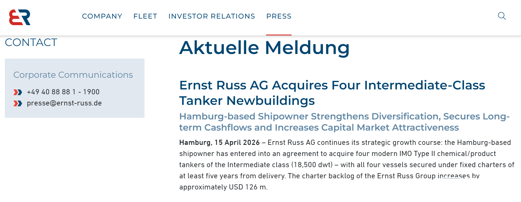 根据Ernst Russ公布的信息,4艘化学品/成品油轮均已签订至少五年期定期租船合同,租期自交付之日起生效,将为该公司的租船订单储备增加约1.26亿美元。该系列租船合同附带延期选择权,已确保未来五至八年的稳定现金流。