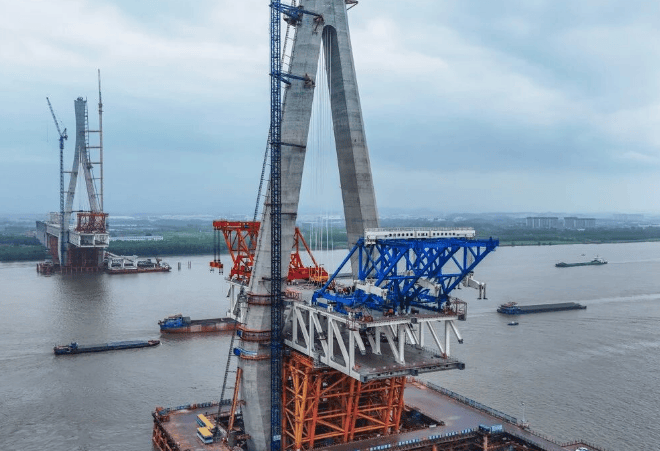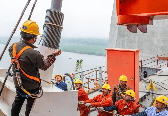 维度网讯,4月16日,池州长江公铁大桥3号北主塔顺利完成首对斜拉索挂设,标志着该项目建设全面进入斜拉索安装与主跨钢梁架设施工新阶段,为年内实现大桥合龙奠定了坚实基础。