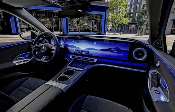 内饰方面,新车搭载一块39.1英寸MBUX超联屏,分为仪表、中控和副驾娱乐三个区域。方向盘采用双三辐式设计,并运用材质拼接工艺。车机系统集成了ChatGPT 4o、微软和谷歌的AI技术,支持增强现实平视显示功能。