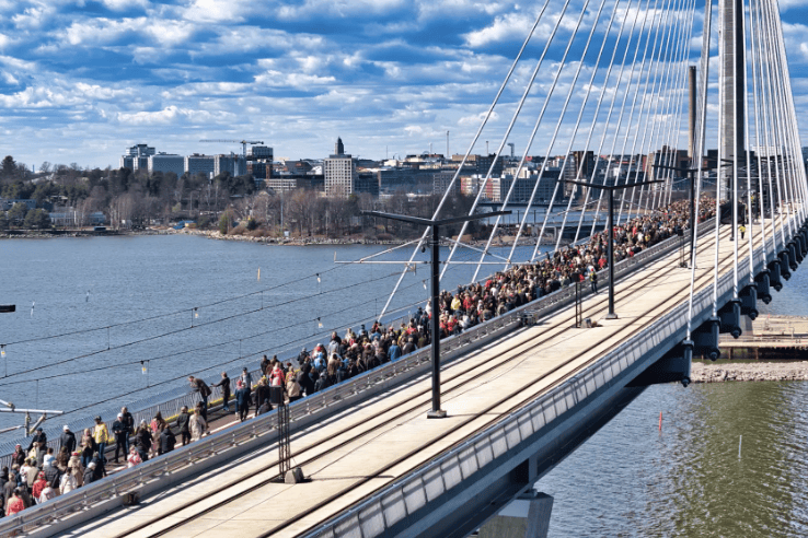 该斜拉桥连接赫尔辛基市中心与Laajasalo岛屿区,旨在支持海滨社区开发,并提供低碳交通方式进入城市。其标志性元素是一个135米高的中央桥塔,呈细长钻石形状,灵感来自当地历史,设计为从空中和城市天际线可见的视觉标识。桥梁包括两个250米的主跨,可容纳行人、自行车骑行者,并计划从2027年起运行连接Laajasalo与市中心的新电车线路。2026年4月,桥梁对步行和自行车交通开放,标志着项目的首个运营阶段。