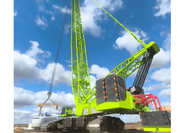 ZCC16000履带起重机专为风电安装设计,在标准工况下无需超起系统即可安装120米高、7兆瓦的风电机组,配备超起后能处理170米高的风机。在塔什干施工现场,其模块化设计和配重技术有效应对了松软沙地基的挑战,保障了吊装精度。