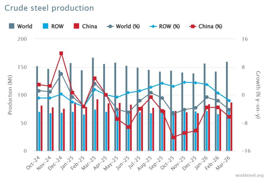 3月全球粗钢产量同比降4.2%,中国产量降6.3%